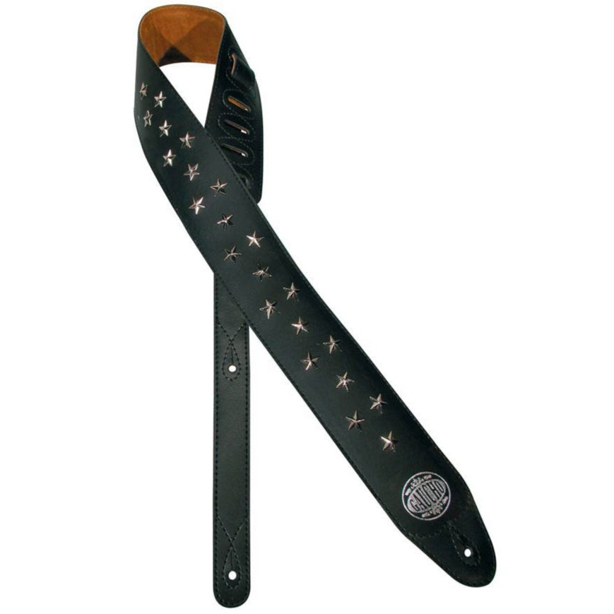 A Gaucho 'Biker Series' heavy duty leather-look guitar strap in black featuring silver stars.